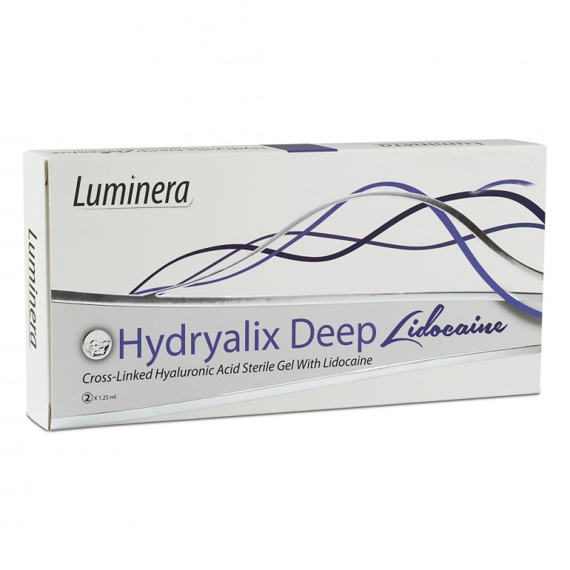 Luminera Hydryalix Deep Lidocaine is indicated for injection into the deep dermis to correct deep facial wrinkles and folds, such as nasolabial folds and marionette lines. Luminera Hydraylix Deep Lidocaine is also recommended for injection into the periorbital area (e.g. eyelids, bags under the eyes, eye wrinkles), glabella or periocular area, lips, and perioral region, and superficial dermis. Contains lidocaine, a powerful anesthetic, for a more comfortable injection.